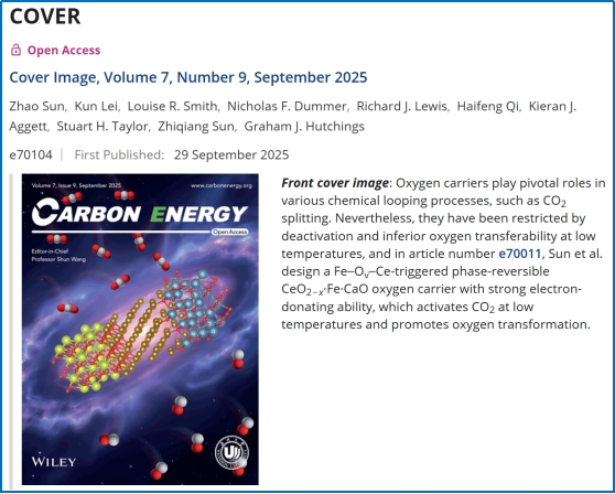 近日,公司孙志强教授团队在国际权威期刊《碳能源》(Carbon Energy,IF: 24.2)上发表了题为“调制Fe-Ov-Ce触发的可逆相变载氧体以增强化学链CO2裂解”(Tailoring Fe-Ov-Ce triggered phase-reversible oxygen carrier for intensified chemical looping CO2 splitting)的研究论文,并被选为期刊封面论文。孙朝副教授、2021级博士生雷坤为共同第一作者,孙志强教授、英国卡迪夫大学Graham J. Hutchings教授为共同通讯作者,球王会为第一署名单位和通讯单位。