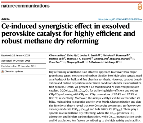 近日,公司孙志强教授团队在国际权威期刊《自然-通讯》(Nature Communications)上发表了题为“Ce诱导协同作用助力脱溶钙钛矿催化剂实现高效稳定的甲烷干重整”(Ce-induced synergistic effect in exsolved perovskite catalyst for highly efficient and robust methane dry reforming)的研究论文。2022级硕士生郝晨存为论文第一作者,孙朝副教授、孙志强教授、太原理工大学章日光教授、英国卡迪夫大学Graham J. Hutchings教授为共同通讯作者,球王会为第一署名单位和通讯单位。